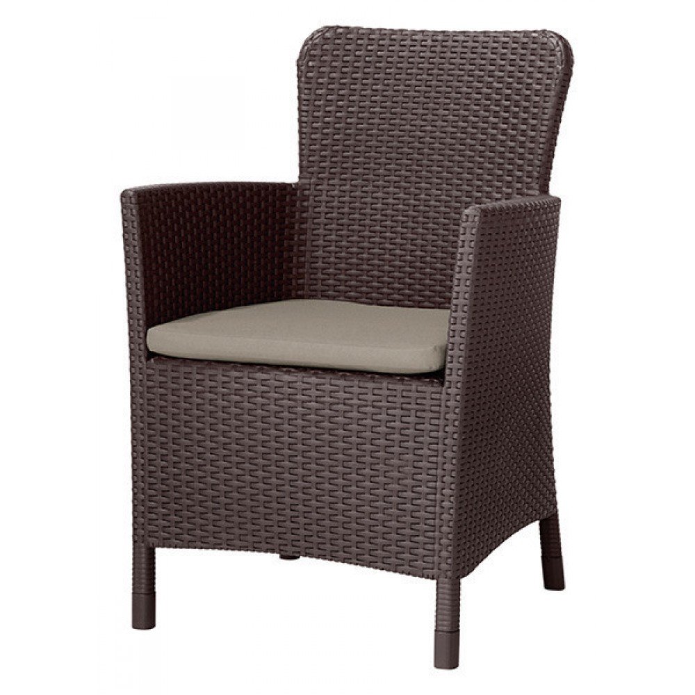 Miami - це зручне крісло з спинкою, що закруглює, яке являє собою поєднання стилю і комфорту. Крісло чудово доповнить дизайн відкритого простору, а також гармонійно виглядатиме у стилі інтер'єру. Оригінальна ротангова фактура поверхні - особливість даної моделі, яка є безперечною перевагою між аналогами. Модель проста у догляді, міцна, стійка до впливу погодних умов та УФ-променів; виконана у класичних кольорах. Крісло Miami DC може використовуватися як стілець, оскільки висота сидіння відповідає висоті звичайного стільця. Пластикове крісло Miami DC оснащене підлокітниками та м'якою подушкою, яка робить відпочинок у кріслі дуже комфортним. Крісло виконане з погодостійкого пластику, який імітує штучний ротанг, не вигоряє на сонці, що не деформується, може зберігатися на вулиці цілий рік. Чохол на подушці виготовлений із водовідштовхувальної тканини, таким чином крісло Miami DC ідеально підходить для дачі, саду чи заміського будинку, а також може бути встановлене на балконі. Переваги: Ергономічний дизайн Зроблено із міцного пластику Неметалічна рама - не іржавіє та не гниє Легке складання Завдяки стійкому до високих температур поліпропілену, колір не вигоряє і не тьмяніє Матеріал: мистецтв. ротанг (пластик, поліпропілен); Колір бежевий; коричневий; Бренд: Allibert® (Голландія); Комплектація: подушка - 1 шт стілець - 1 шт Розмір: 62*60*89 см Вага: 5,2 кг Макс. навантаження: 110 кг Розмір упаковки: 80*60*21 см Варіація кольору: Сірий