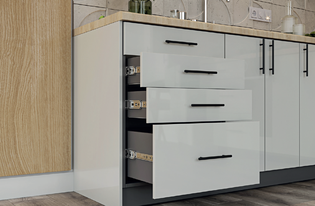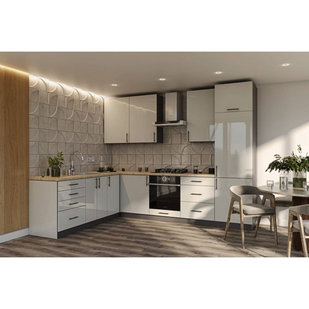 Ручка, пристінний борт, цоколь, ущільнювач для цоколя, планка стикування, заглушки, сушка для посуду, лоток для столових приладів продаються окремо.