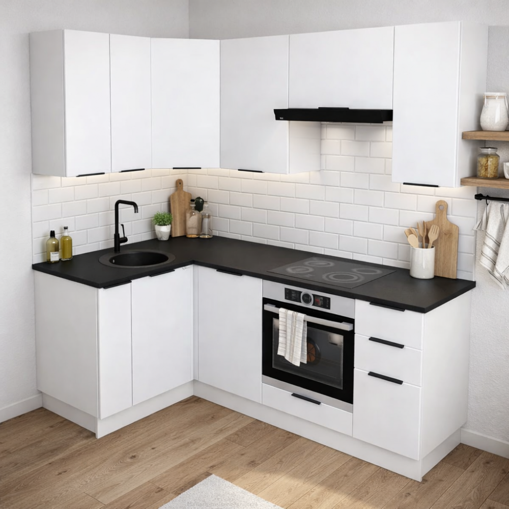 Комплектація - секції з фасадом та ручкою профільною чорною. Стільницею, цоколем укомплектовується додатково.