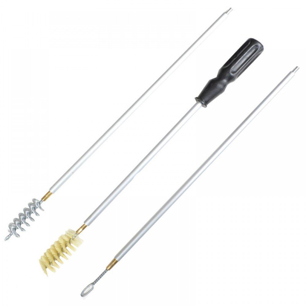 Наш магазин рекомендує придбати для чищення гладкоствольної зброї, який складається з шомпола, розділеного на 3 секції, сталевого та щетинистого йоржа та вішера.