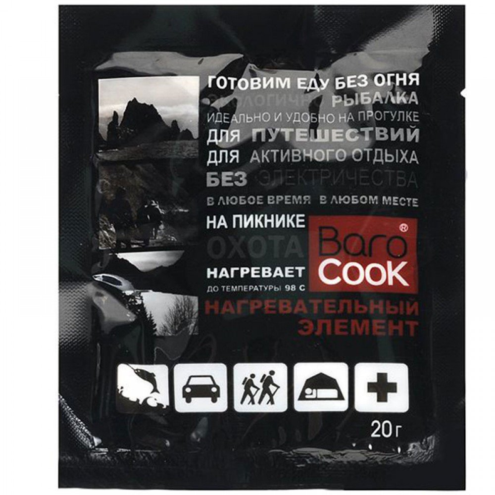 Нагрівальний елемент для системи швидкого приготування їжі BaroCook. Для застосування, необхідно помістити в пластиковий контейнер системи і залити водою, при контакті з якою він починає працювати. Повноцінний гарячий обід на природі можна досить швидко приготувати, використовуючи лише один пакет з активною речовиною. Відмінно підійде для туристів, туристів ;мисливців і рибалок.        Нагрівальний елемент "BaroCook" дозволить зручно, швидко та абсолютно безпечно нагріти воду до температури 98°С. Необхідно використовувати тільки разом із контейнерами "BaroCook".         BaroCook — це абсолютно безпечна та надійна технологія, яка розроблялася не менше 5 років досвідченими експертами. Термоелемент абсолютно нешкідливий для людини та навколишнього середовища.