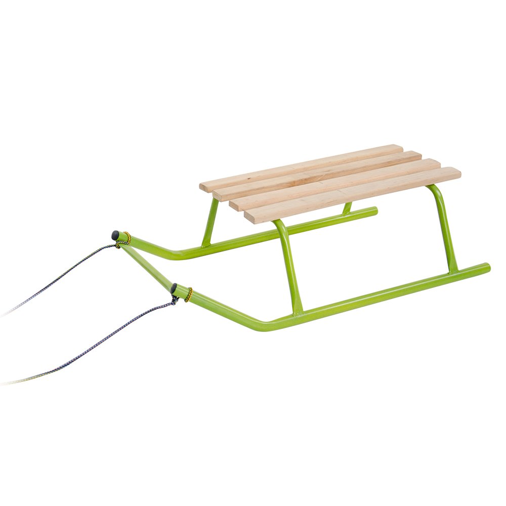 Колір санок - лимон, каркас металевий, сидіння виконане із міцних порід дерева.